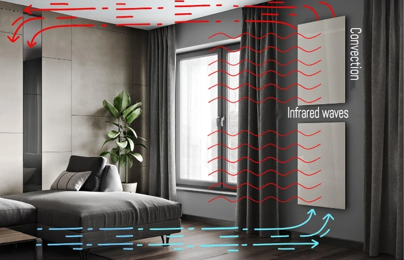 The warmed ceramic panel up to the temperature of 65-70° With is the effective thermal source working in an infrared range in the long-wave range of 7-14 microns. The convection heat flux is formed between a wall (on which the panel hangs) and the panel which back is warmed up to 80-85 °C. High level of thermal efficiency several times cuts down expenses on heating in comparison with traditional types of heating.